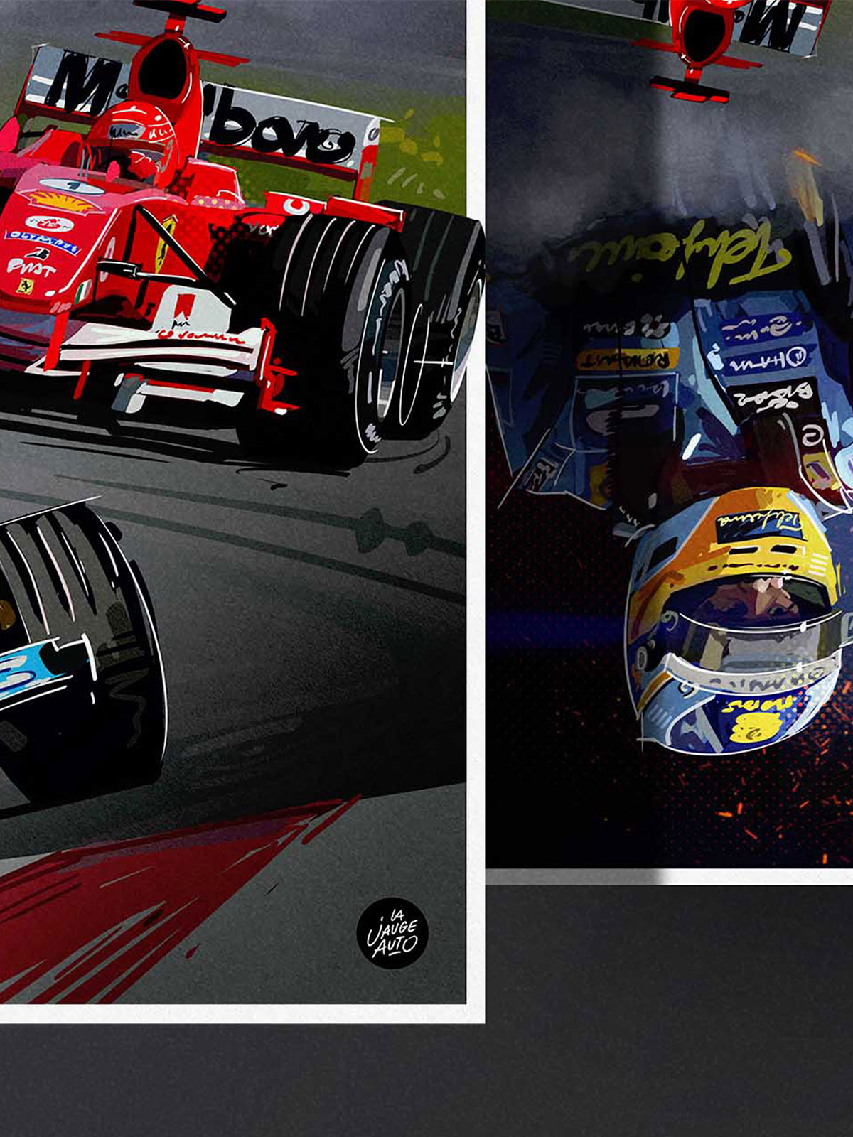 Idéal pour les passionnés de Formule 1, les nostalgiques des grandes rivalités sportives, ou tout collectionneur cherchant à immortaliser des icônes du sport automobile.