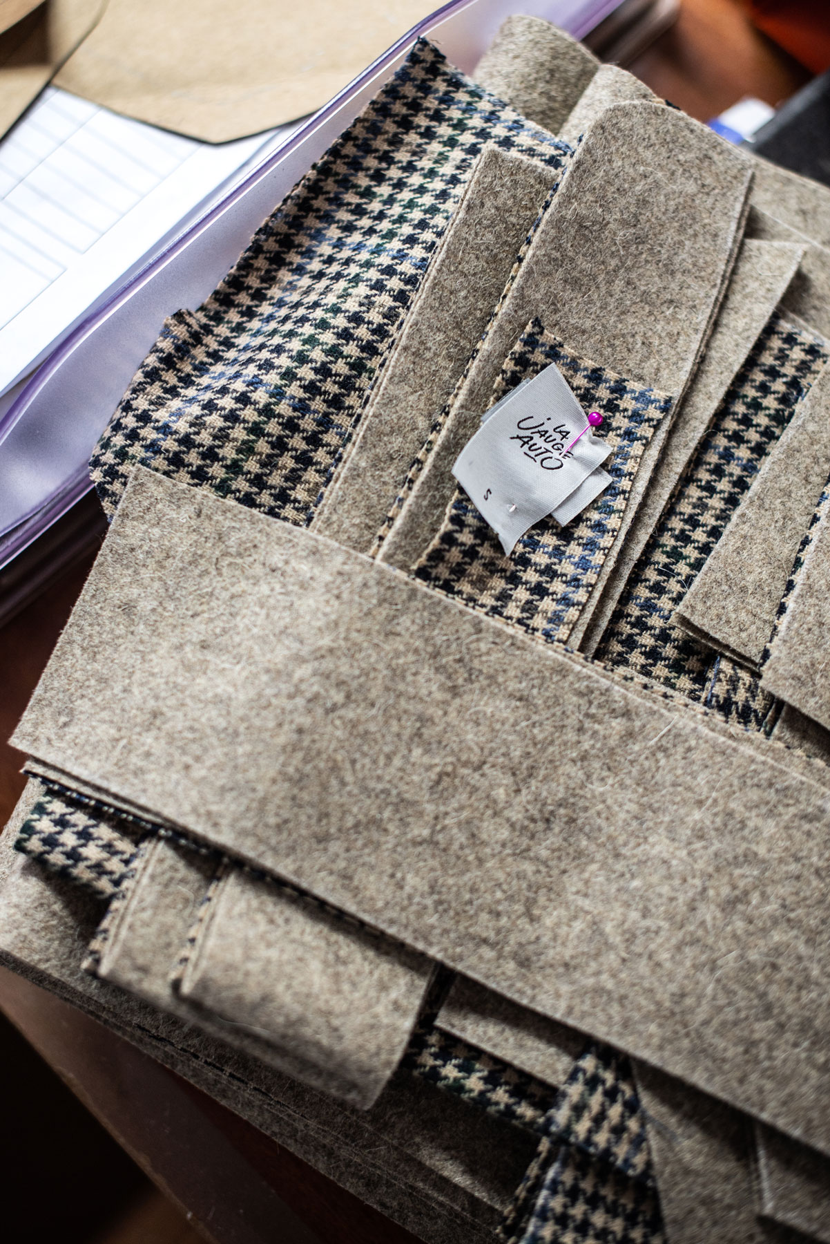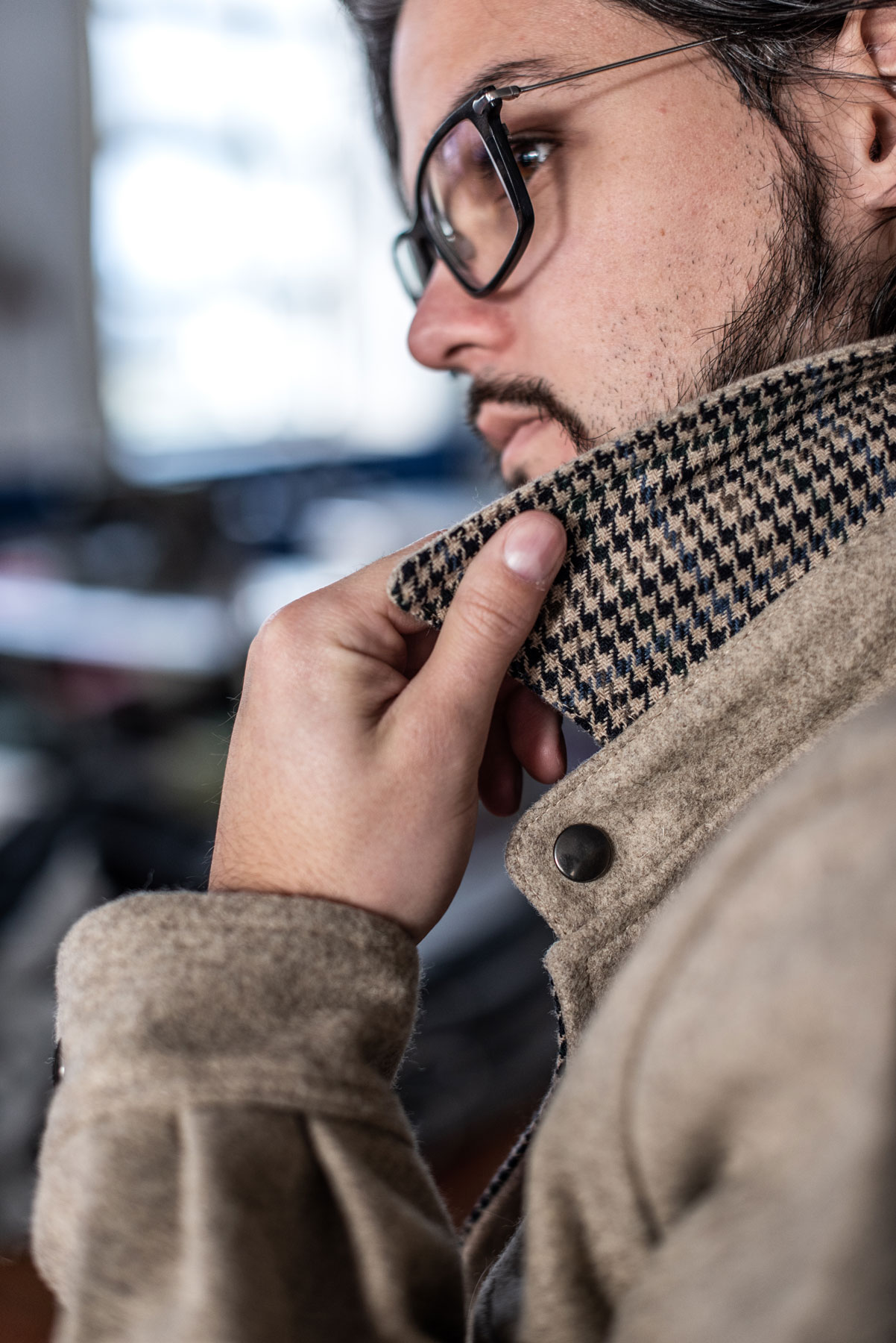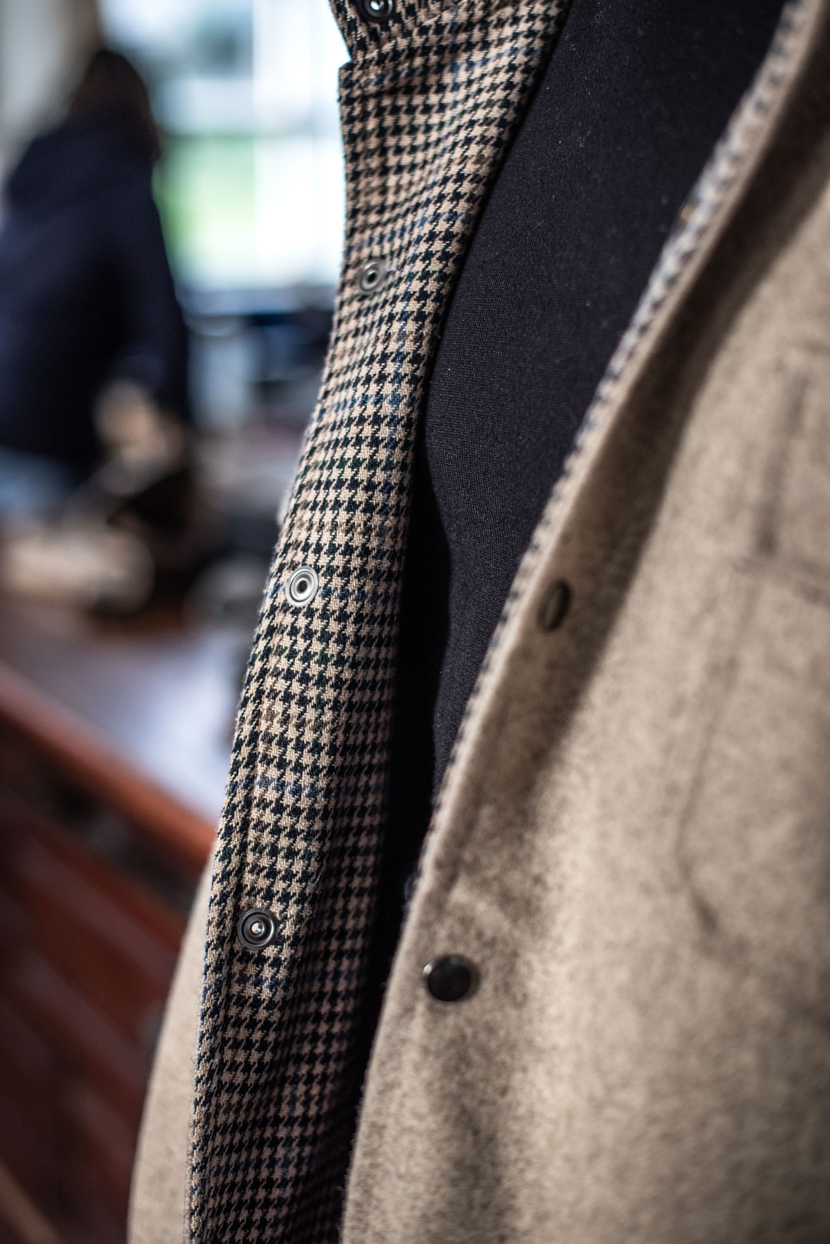 - Doublure : pied de poule noir, marron et bleu (intérieur surchemise, intérieur poches raglan, revers poches à rabat, revers col et revers manches)